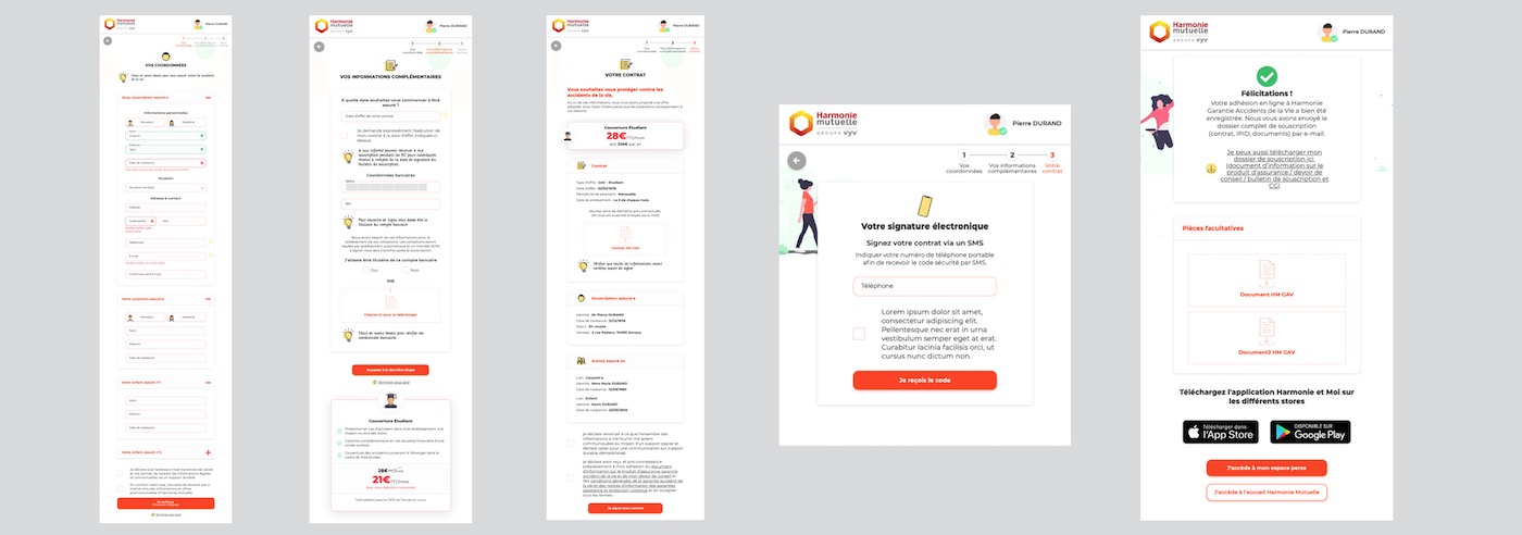 Eficiens a mis tout son savoir-faire pour s’occuper de la conception et de la DA qui ont été effectuées par un UX designer spécialisé dans le secteur assurance-mutuelle. Le but était de proposer un parcours à la pointe de la modernité tout en collant au mieux à la charte Harmonie Mutuelle.