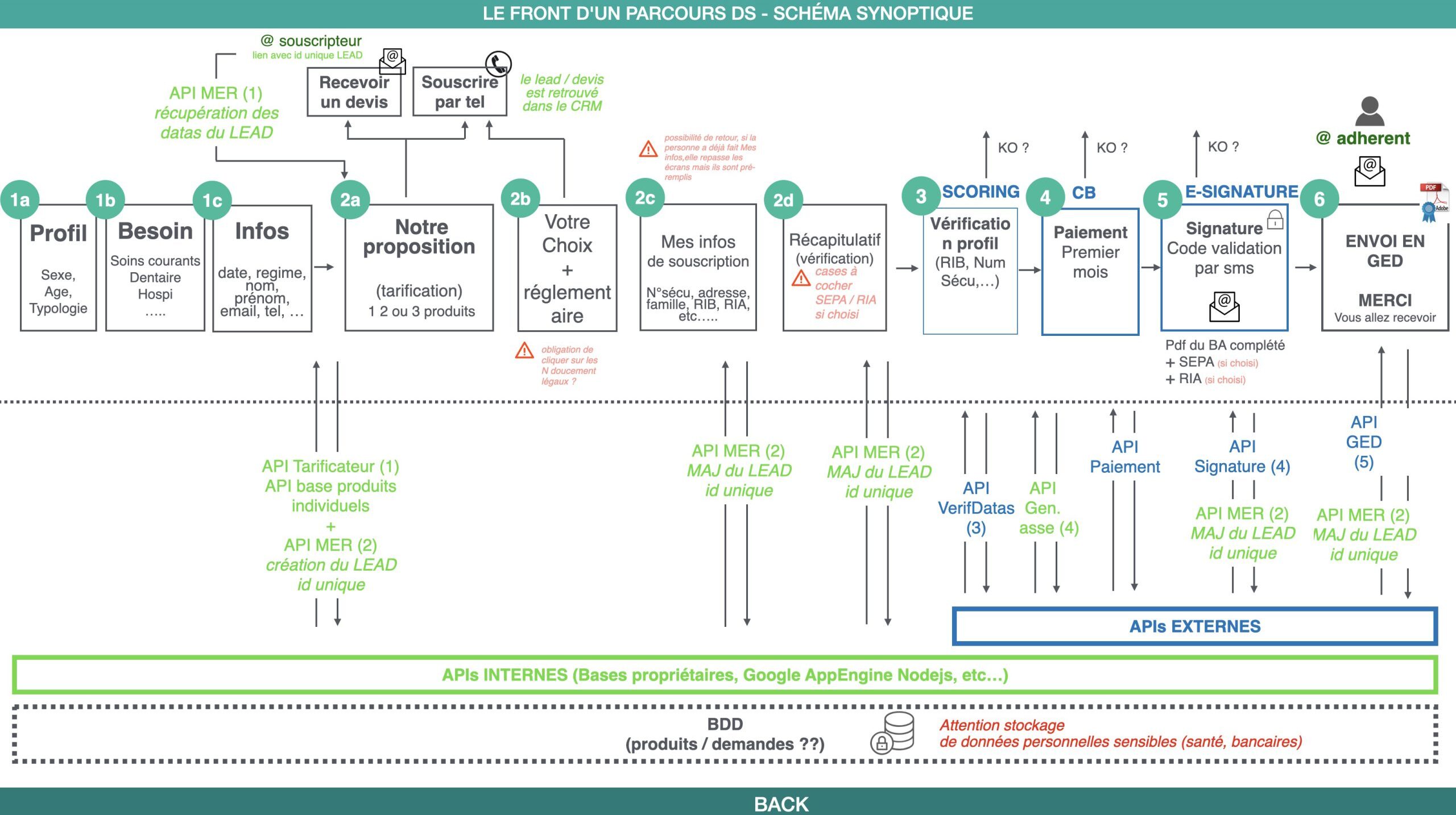 Eficiens a été impliquée très tôt dans le projet y compris au niveau de la structuration des offres pour notamment les simplifier. Cette démarche de co-construction marketing est assez fréquente dans ce type de projet. Une attention toute particulière a été mise sur la partie réglementaire (recueil des besoins, consultations et traçabilité des fiches d’information, tableaux de garantie). D’autres fonctionnalités afin de faciliter l’usage sont développées : lien token pour revenir plus tard sur le parcours, envoi par email du devis, embasement temporaire pour prévenir tout risque de rupture d’API (mini CRM codé), relance des abandonnistes…