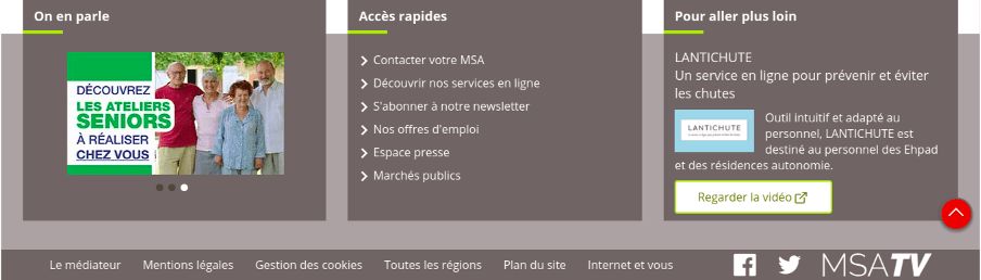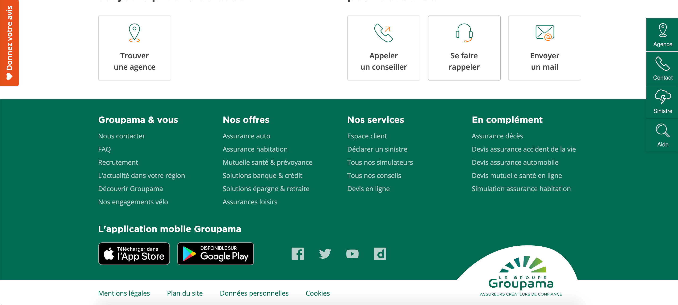 Le footer de Groupama est parfaitement optimisé avec un design simple et efficace. Pour faciliter la navigation, les éléments les plus importants sont mis en avant sur la barre de droite.