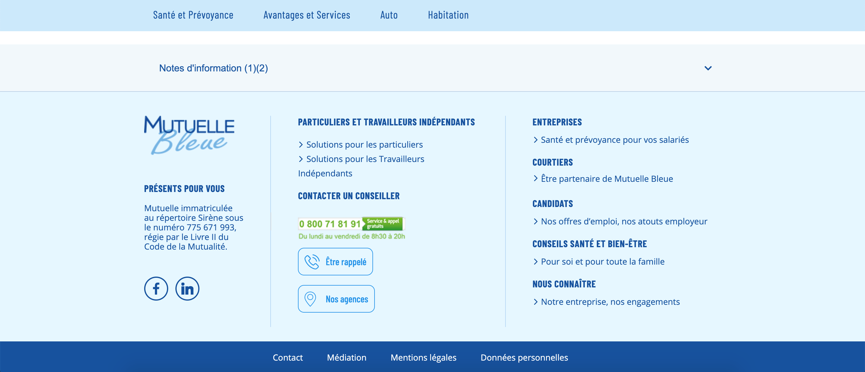 Très agréable à lire, le pied de page de Mutuelle Bleue propose plusieurs catégories en fonction des utilisateurs.