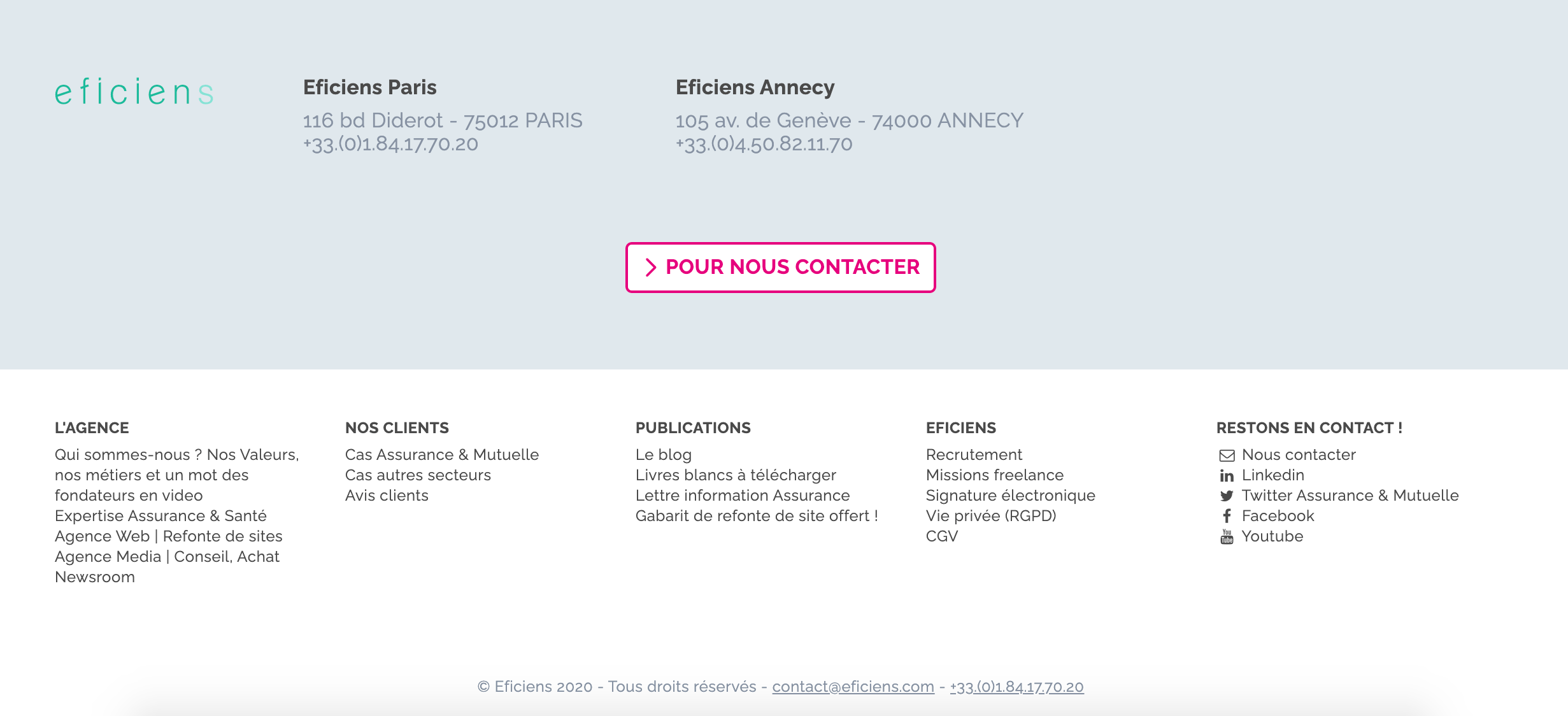 Et pour finir, le pied de page Eficiens présente les éléments essentiels ainsi que les réseaux sociaux ou encore un lien vers les témoignages, et tout cela, de manière hiérarchisée pour faciliter la lecture.