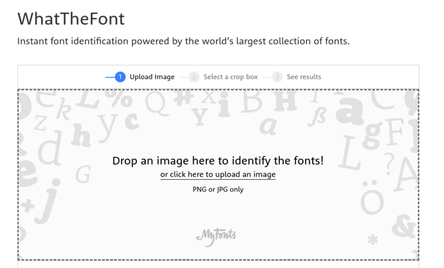 - WhatTheFont ou Myfonts : c’est l’un des meilleurs sites pour identifier les caractères d’une image. Il vous suffit de télécharger l’image pour que l’outil recherche les zones de texte et vous informe sur la police correspondante. À noter que WhatTheFont est à la fois un site et une extension.