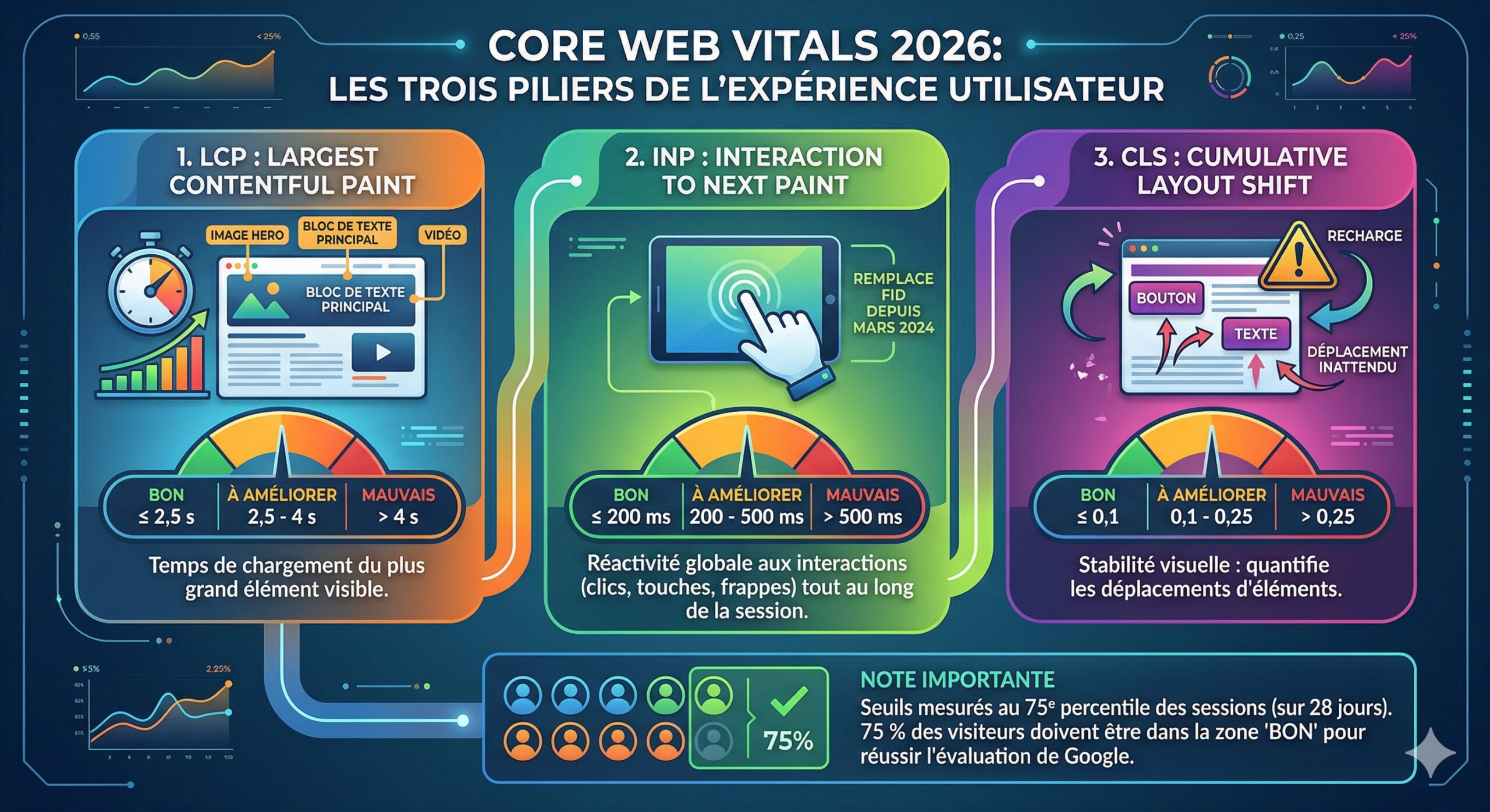 Ces seuils sont mesurés au 75e percentile des sessions utilisateurs sur les 28 derniers jours — c’est-à-dire que 75 % de vos visiteurs doivent bénéficier d’une expérience dans la zone « bon » pour que votre page soit considérée comme performante par Google.