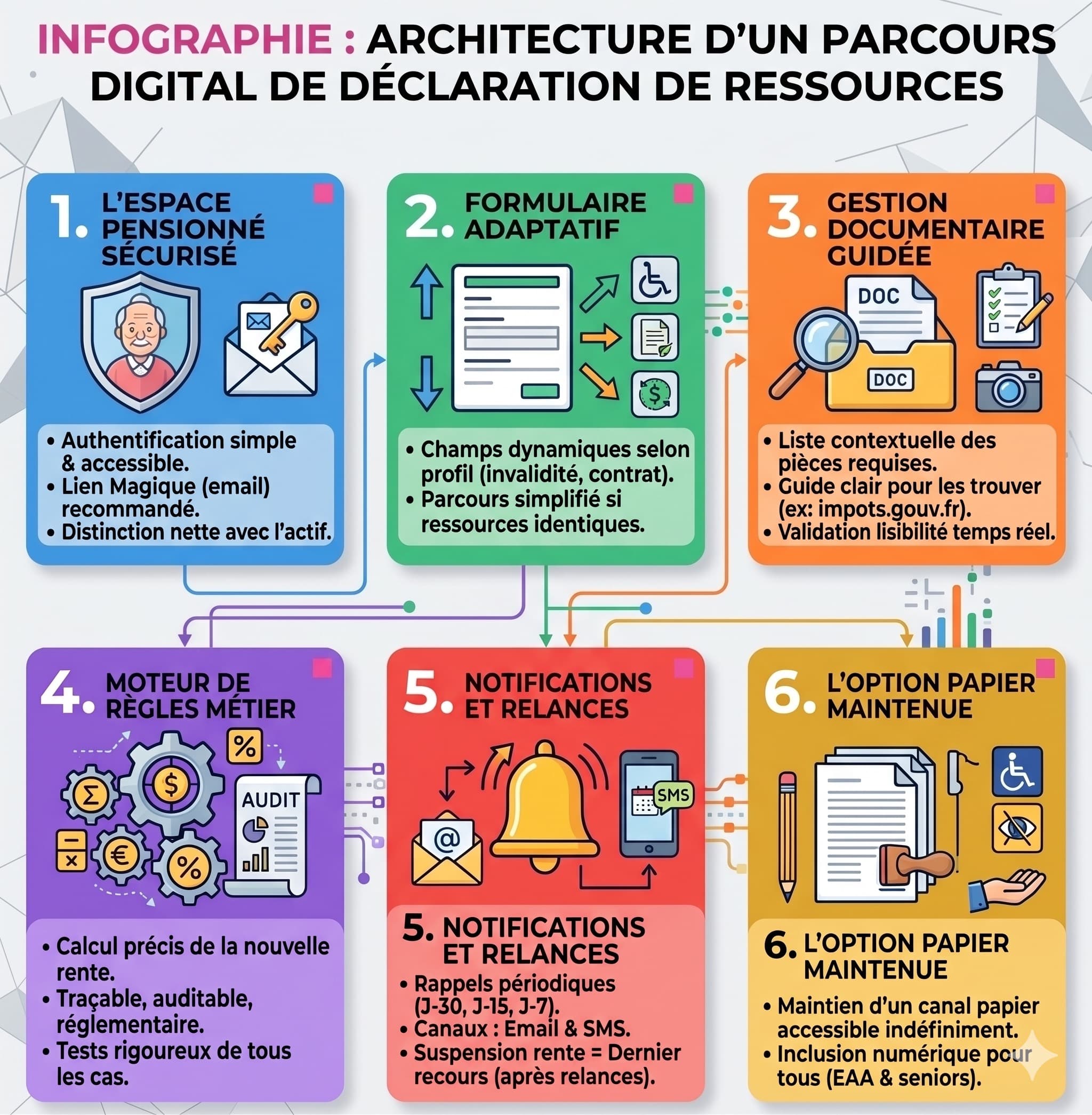 Contrairement au parcours arrêt de travail où le tout-digital peut rapidement devenir la norme, la déclaration de ressources doit maintenir une option papier accessible indéfiniment pour les pensionnés qui ne peuvent pas utiliser le digital. Ce maintien n’est pas un aveu d’échec — c’est une exigence de la directive EAA (accessibilité numérique) et une obligation morale envers un public qui inclut des personnes en situation de grande dépendance.