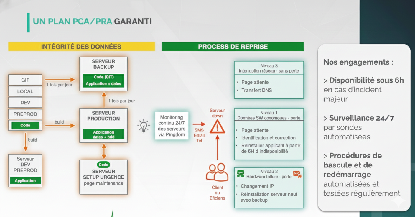 Différents types d’incidents appellent des réponses graduées. Un crash de service web rendant le site inaccessible nécessite un redémarrage des services sur le serveur de production, généralement résolu en moins de 4 heures. Un piratage ou une intrusion compromettant le site implique soit un nettoyage approfondi avec audit de sécurité, soit une bascule sur le serveur de préproduction, avec un délai de résolution de l’ordre de 8 heures. La perte totale du serveur de production suite à un incident matériel grave déclenche l’activation complète du PRA : récupération de la dernière sauvegarde, restauration sur le serveur de secours et bascule DNS, le tout en moins de 24 heures.