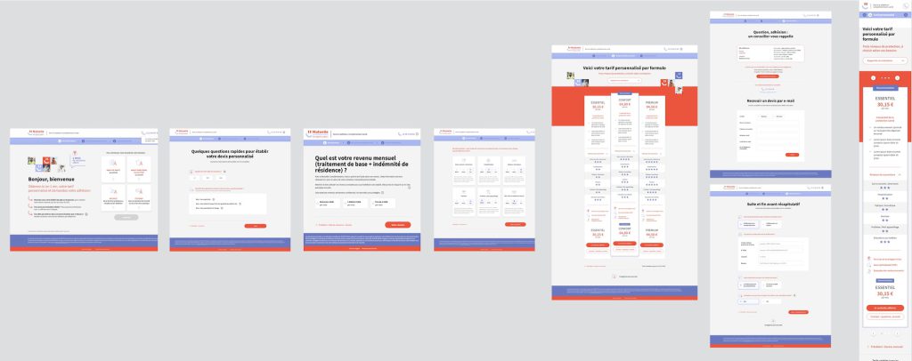 - Un ensemble d’écrans enchainés avec une UX au meilleur niveau notamment sur mobile en 4 étapes : conception, wireframing, DA et intégration technique front/back